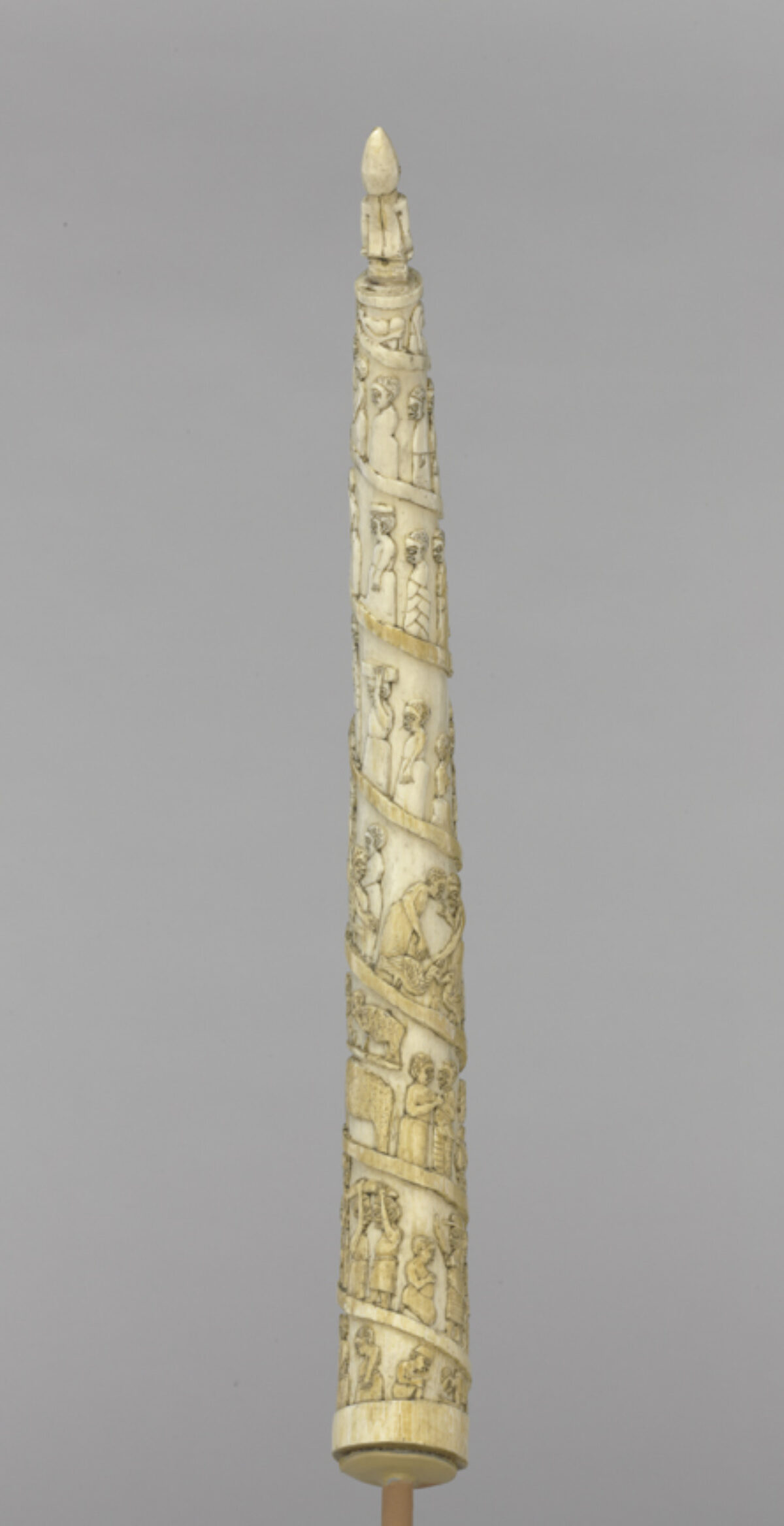 Look closely, and you will see scenes of 19th-century life in the Kingdom of Kongo carved into this tusk. People greet each other on the street. Porters carry heavy boxes and ivory tusks. Monkeys laugh. Since 1483, when Portuguese sailors first arrived in the region, the Kingdom of Kongo served as an important trading partner for European nations. Between 1850 and 1910, Kongolese artists memorialized these scenes on carved tusks created for European traders.