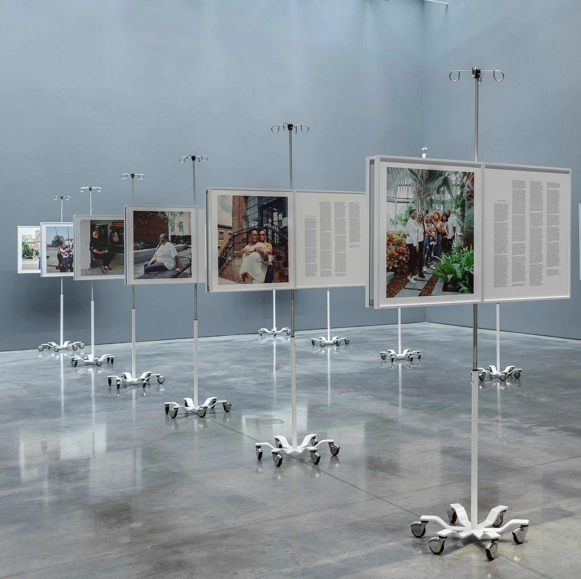 BALTIMORE, MD (August 14, 2024)—The Baltimore Museum of Art (BMA) announced today the November opening of LaToya Ruby Frazier’s acclaimed installation More Than Conquerors: A Monument for Community Health Workers of Baltimore, Maryland 2021-2022. Featuring a series of portraits and related narratives mounted on 18 socially distanced, stainless-steel IV poles, the large-scale installation captures and celebrates the essential work of community health workers in Baltimore during the rollout of the COVID-19 vaccine. Powerful and evocative, the installation monumentalizes the community health workers’ efforts and offers an alternative approach to monument-making that challenges us to consider the nature of how and who we honor. The work was originally commissioned for the 58th Carnegie International, where it won the Carnegie Prize.