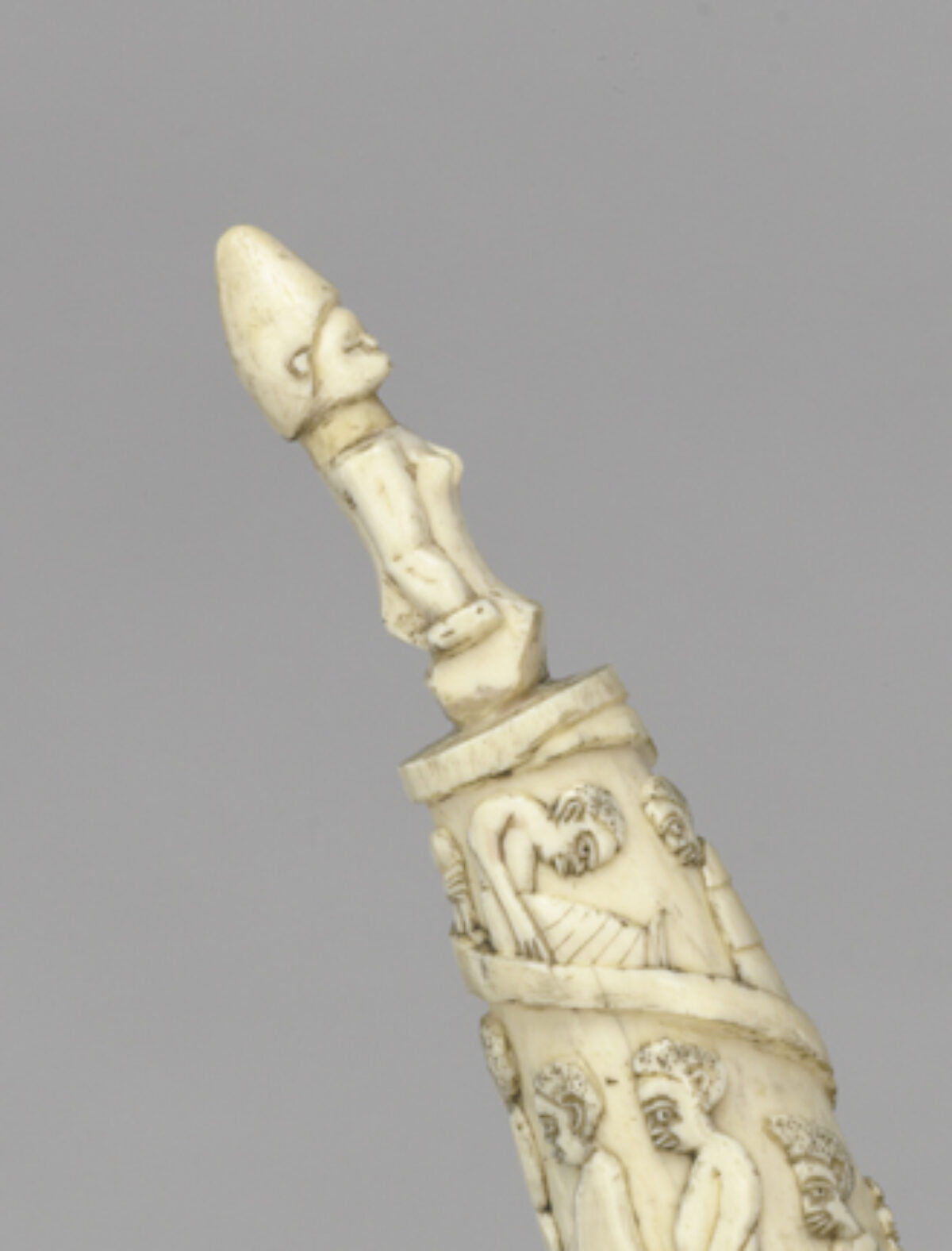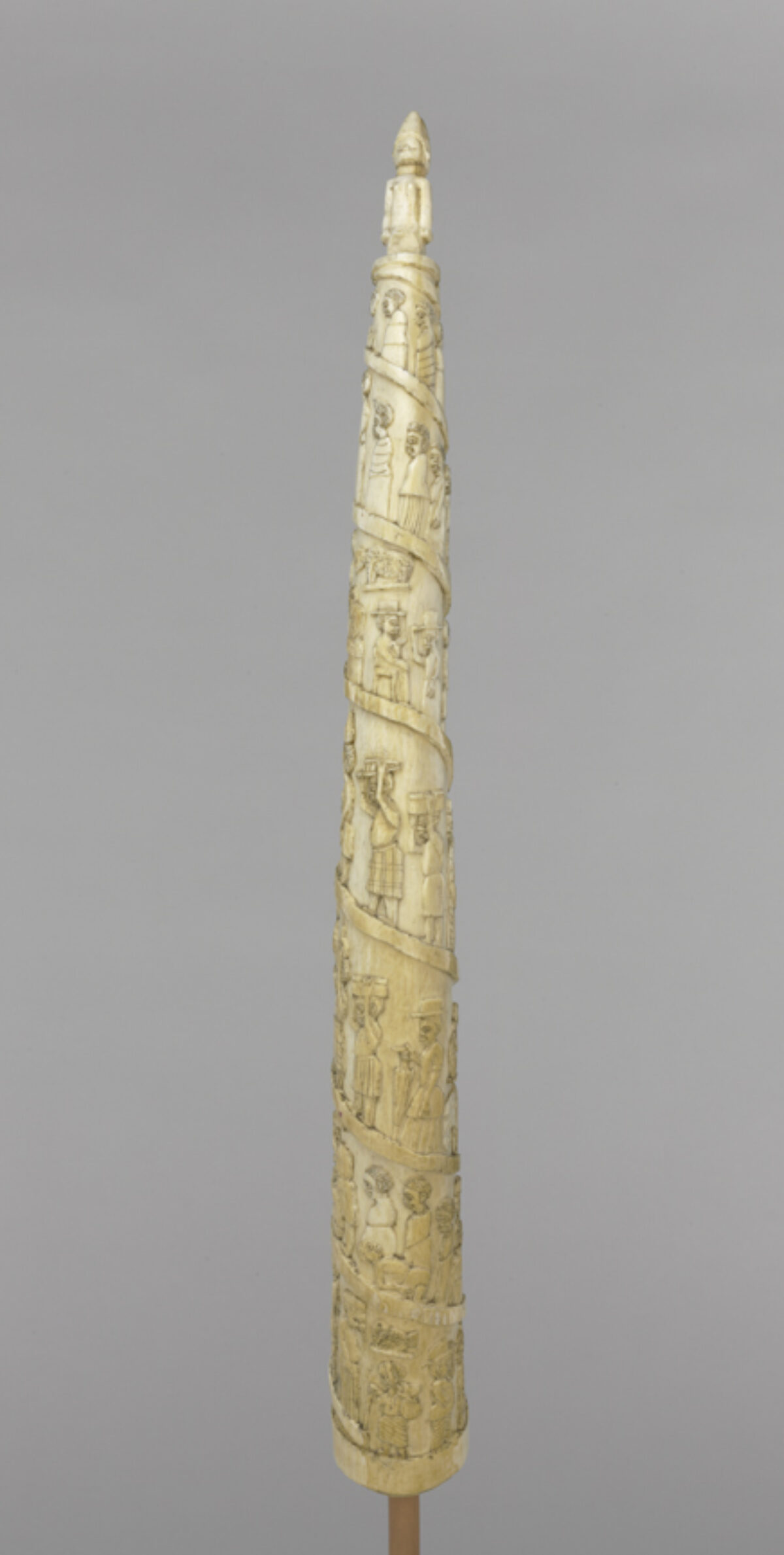 Look closely, and you will see scenes of 19th-century life in the Kingdom of Kongo carved into this tusk. People greet each other on the street. Porters carry heavy boxes and ivory tusks. Monkeys laugh. Since 1483, when Portuguese sailors first arrived in the region, the Kingdom of Kongo served as an important trading partner for European nations. Between 1850 and 1910, Kongolese artists memorialized these scenes on carved tusks created for European traders.
