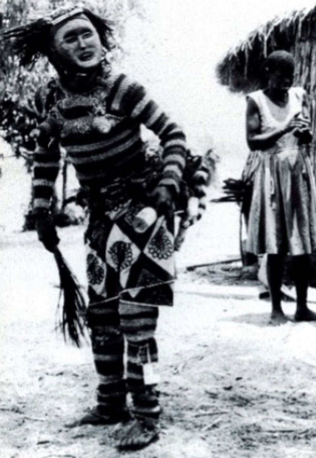 Initiated men are the ones who perform the Mwana Pwo masquerade. They wear a costume made of braided plant fiber and adorn themselves with wooden breasts and a skirt. This, however, is not an act of personal gender expression. Rather, it is an act of transformation. When Mwana Pwo dances, the ancestral spirit represented by the mask is thought to come alive, bringing the female ancestor it represents to life in the performance space.