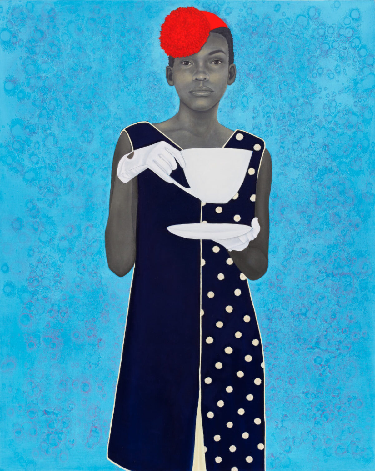 The flash of red provided by this young girl’s hat draws attention to her inquiring gaze. She holds a playfully oversized teacup in a nod to Lewis Carroll’s novel “Alice’s Adventures in Wonderland” (1865), giving the painting a slightly surreal feeling. After more than a decade of dedicating herself to painting, Sherald first gained national attention with this striking work.