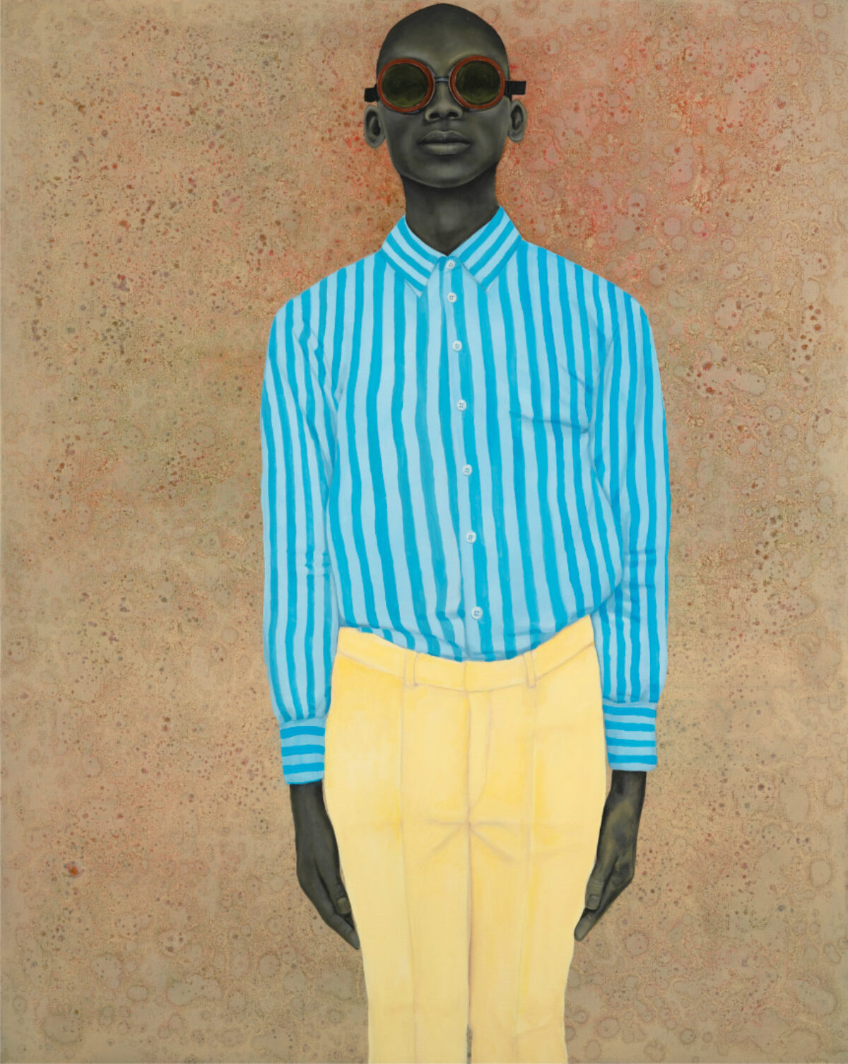 “The Boy with No Past” is a vertical oil painting on canvas, measuring 54 inches by 43 inches. A figure, perhaps in his teens, stands in the center and gazes outward toward the viewer through vintage-looking goggles with deep olive-tinted circular lenses with red frames. The background is dark beige textured by red speckles, which seem to subtly concentrate behind the figure’s head and off to the right of the painting. His skin tone is rendered in grayscale, and the painting crops his legs below the knees. The figure has a bald or closely shaved head, and his arms hang fully extended with his palms pressed against his sides. He wears a loose button-up shirt with medium blue-and-light-blue stripes, which run vertically down the torso and sleeves but horizontally across the shirt’s cuffs and collar. The shirt’s buttons, all of which are fastened, are translucent white or light blue. The shirt is tucked into pastel yellow chinos, which are creased neatly down the center of both legs.