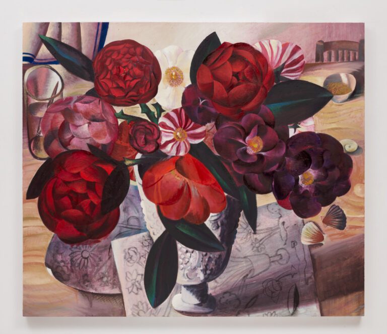 Something I think about and I’ve learned from Matisse is that there can be two modes of representation within a painting of the same subject. That happens a lot in his work, where there are flowers printed on wallpaper and then there are flowers that are in theory in a physical space and are real flowers. I think it’s something I see David Hockney do too—it’s about entering a space with an adjusted idea of reality or naturalism. You believe the painted world more deeply because of these signifiers, almost functioning like a dream.